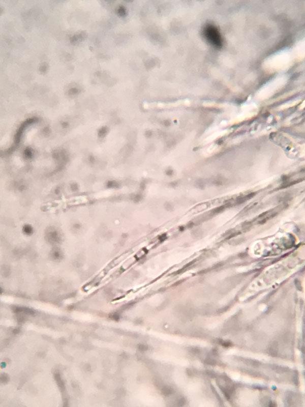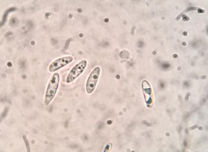 Spores, fusiform to almost cylindrical, guttulate, 10.3-15.6 x 2.9-4.4µm ... average: 12.6 x 3.6µm ... Q: 3.5