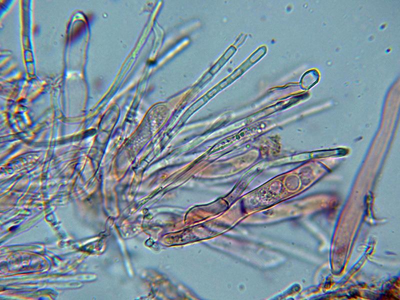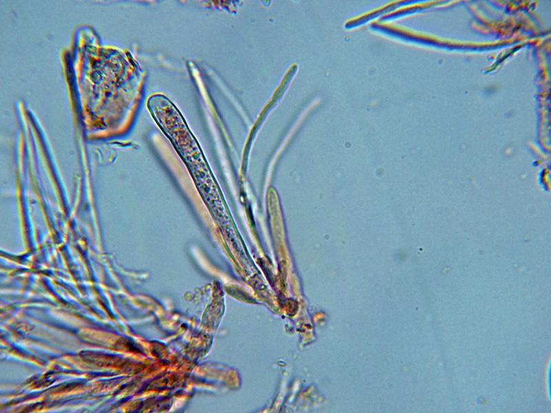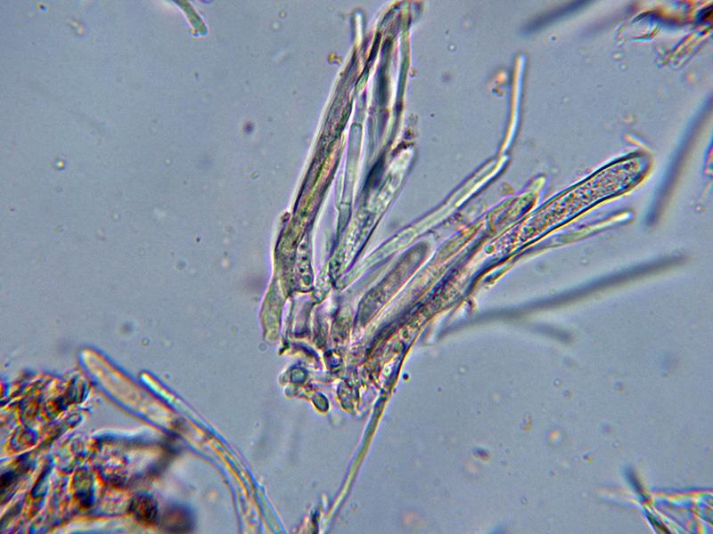 Paráfisis filiformes, muy ramificadas, septadas, con una longitud parecida a la de los ascos, con una anchura de entre 2,3 a 2,8 micras y con contenido en su interior que se colorea de verde al Melzer.