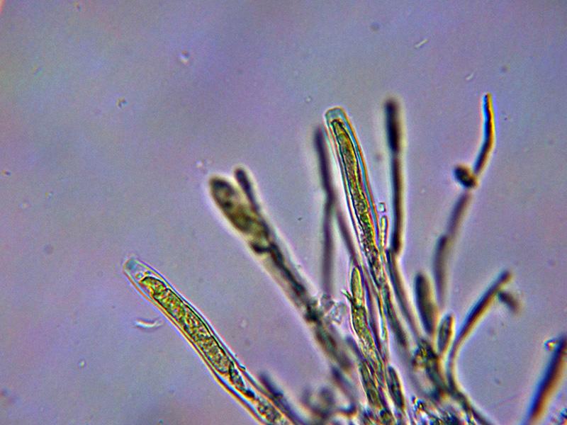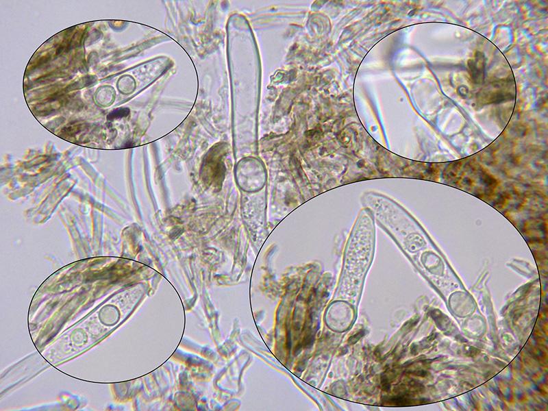 Ascos probablemente octospóricos, uniseriados, con una longitud de 64 a 72 micras y una anchura de entre 6,6 a 9 micras, con reacción amiloide del aparato apical al Melzer y sin croziers observados (-).