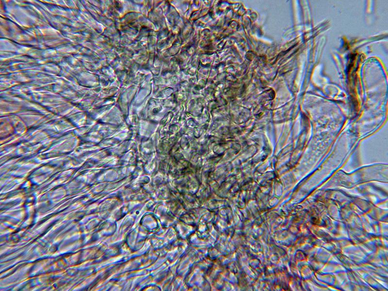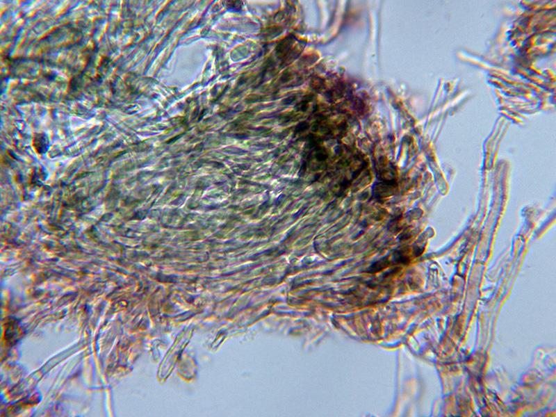 El excÃpulo ectal no aprecié diferencias evidentes con el excÃpulo medular, en ambos casos no pude apreciar hifas globosas, añado un par de imágenes mas que se corresponderÃan con el excÃpulo ectal, es que tampoco se muy bien como describirlo.