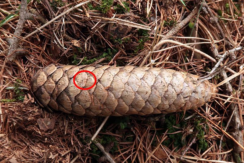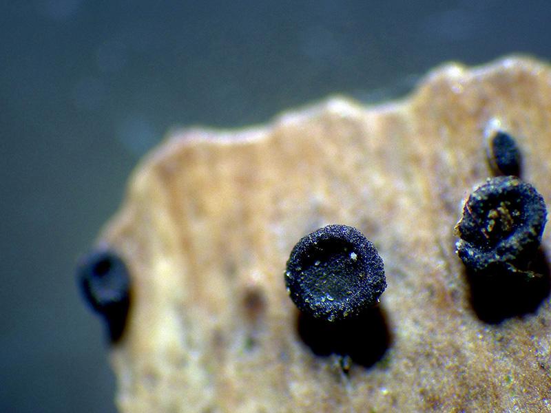 Unos diminutos apotecios sobre la superficie de un cono de Picea abies.
