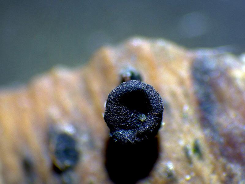 Apotecios en forma de copa con pie corto y ancho de color negro, con un diámetro de entre 0,3 a 0,62 mm. y una altura de entre 0,3 a 0,9 mm.