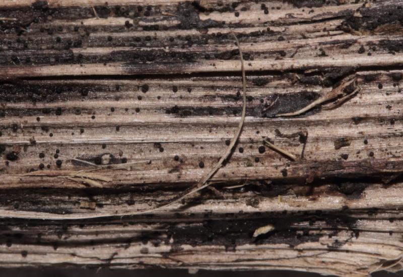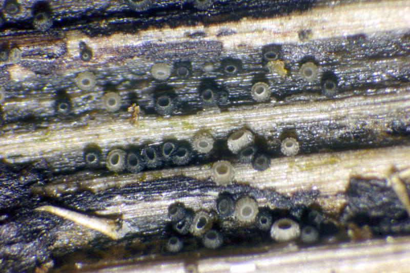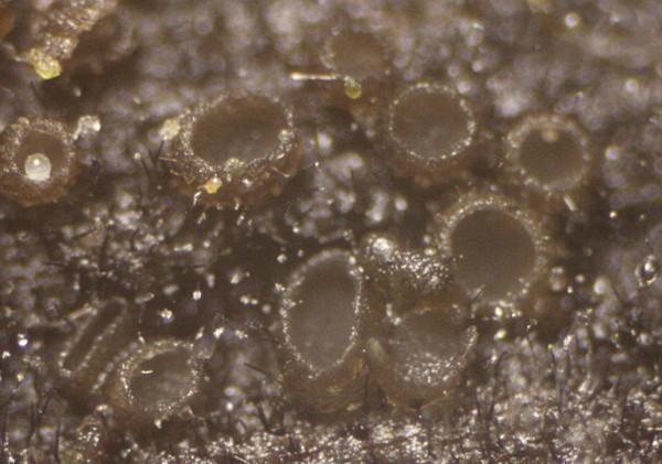 mini cupules < 1 mm en général grises noires mais parfois pâles à face externe feutrée, sur vieille tige de Cirsium palustris asques à petites réaction IKI bleue"cellules géométriques brunes" de la face externe, spores de 6.8 x 1.8 microns