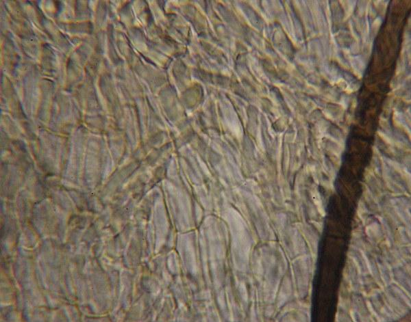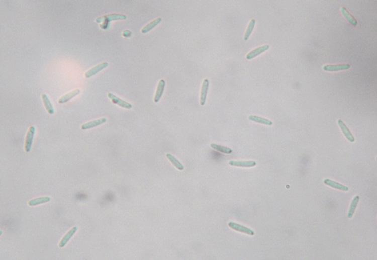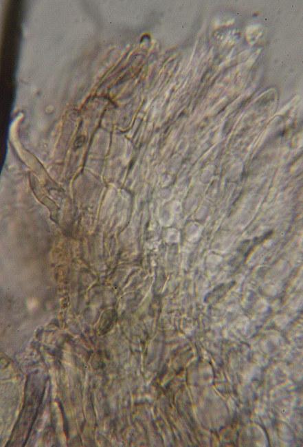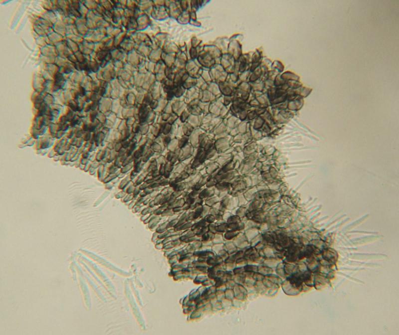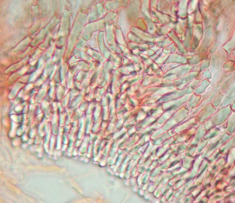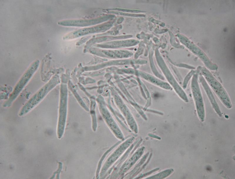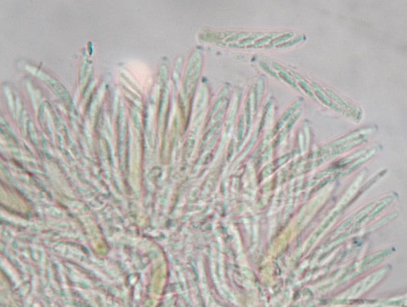pallissade de cellules sombres septées obtuses au sommet, réaction iki bleue des asques ne dépassant guère les 25 microns, spores oblongues étroites de moins 8 microns de long (la sporée est en attente) mais quelques mesures faites sur spores libres dans les préparations.