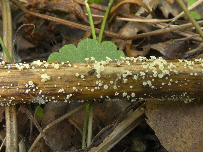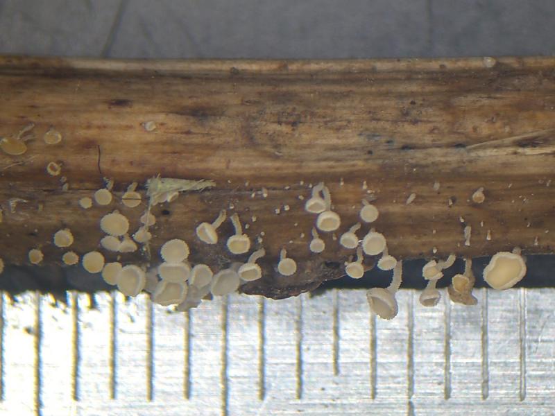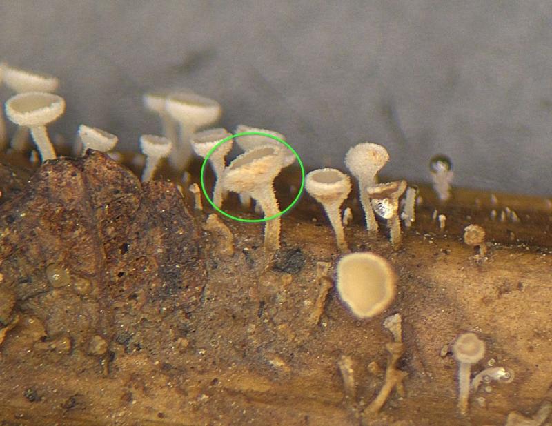 Highly likely this is my case. Temperature stress could be another cause of death besides death in the habitat. Being taken from a lying stem from under a layer of last year's leaves in a very wet place in dark dense thickets at a temperature of 12-14C (as surface groundwater), they were placed in a container with wet cotton, and transported for 10-20 minutes at a temperature of 22-24 C (like air). Usually samples of such small fungi, being taken in a wet habitat, not removed from the substrate and placed into in a moist container, continue to mature and begin to sow spores. But in this case, the fruiting bodies really stopped growing, which indicates their death.