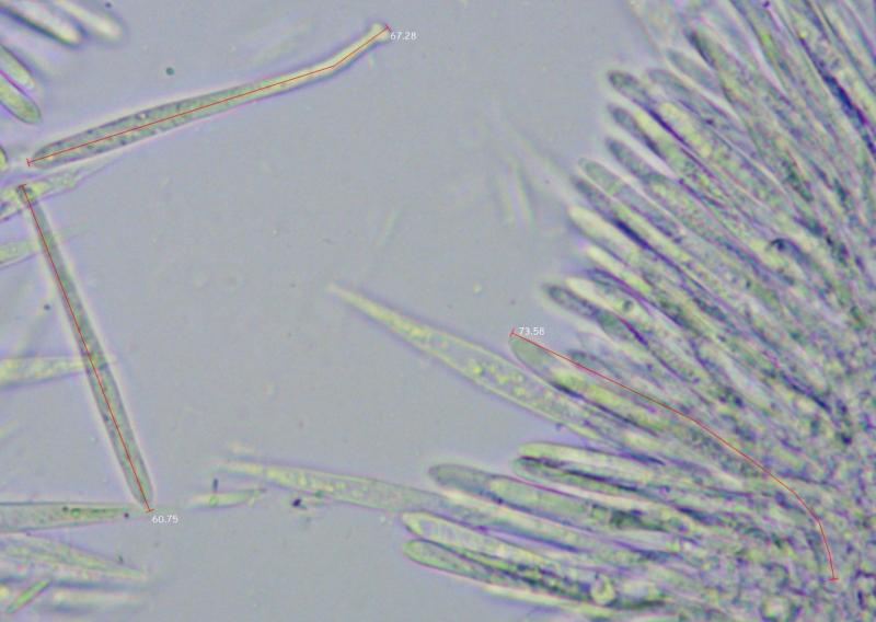 At this time part of the stem with these specimens lives in the humid container. I now (some minutes ago) examined one new specimen (marked on the attached photo) in the water mount. Asci was observed with 60x lens, ascospores - with 100x oil immersion lens. It was 100% living and fresh specimen. This study shows that previous measurements were correct.