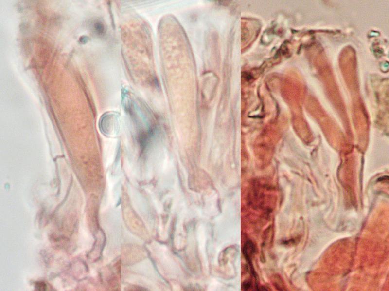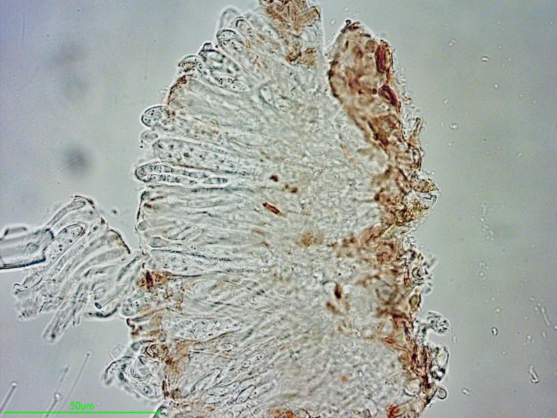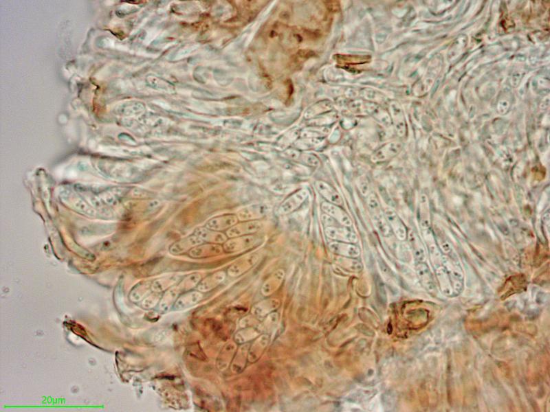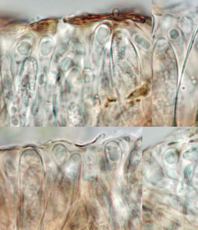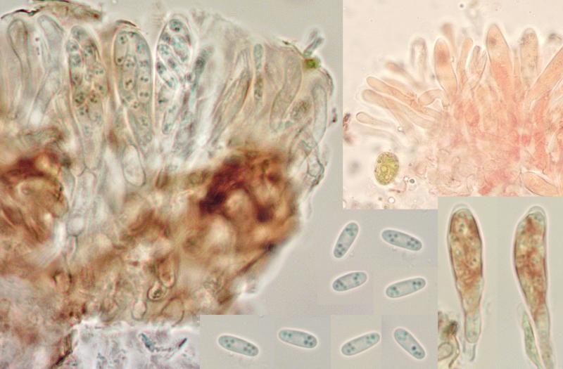 The disks are sessile, 80-200 µm wide, with a darker slightly raised margin. The exciple is covered with a crust covering everything and preventing a view of what is behind. A similar crust is in part also covering the hymenium (pseudoepithecium?). Asci eight-spored, 32-55 × 5.9-7.3 µm, the bases are so agglutinated that I dont't know about croziers, negative in Lugol with and without pretreatment. The spores are 7.0-8.0 × 2.6-2.9 µm, with a few small guttules at each end. The parafyses are slighly clavate, 3.0-4.2 µm at apex and unfortunately so easily dying that I can't say anything about their contents.