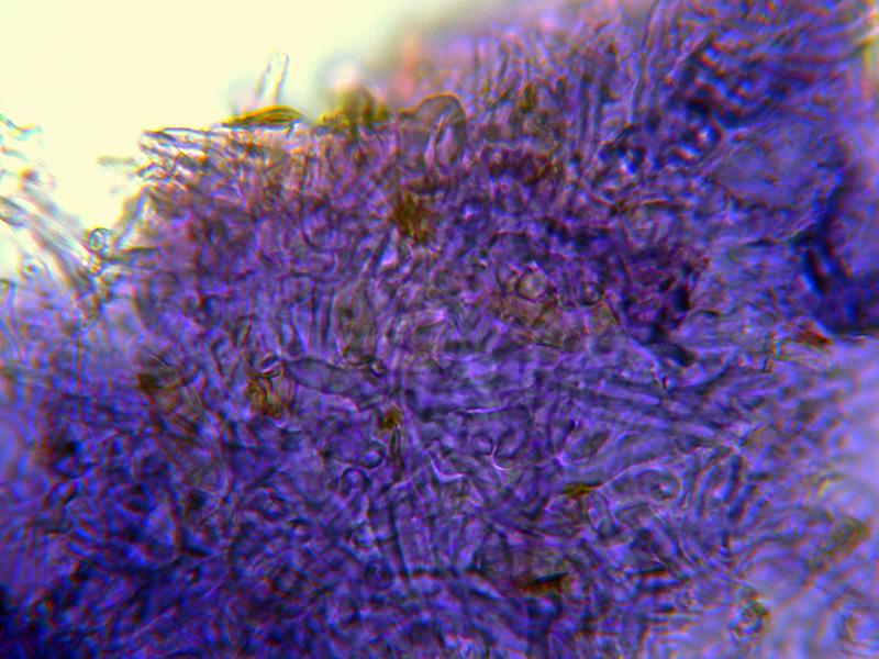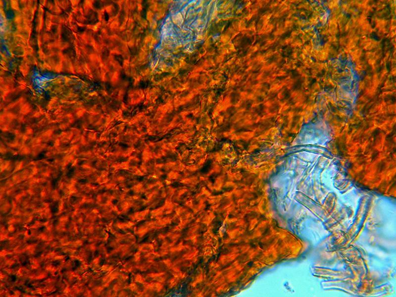 Pared del peritecio formado por hifas filamentosas fuertemente entrelazadas entre si, con abundante pigmento intracelular anaranjado que se vuelve violáceo con el KOH al 20%.