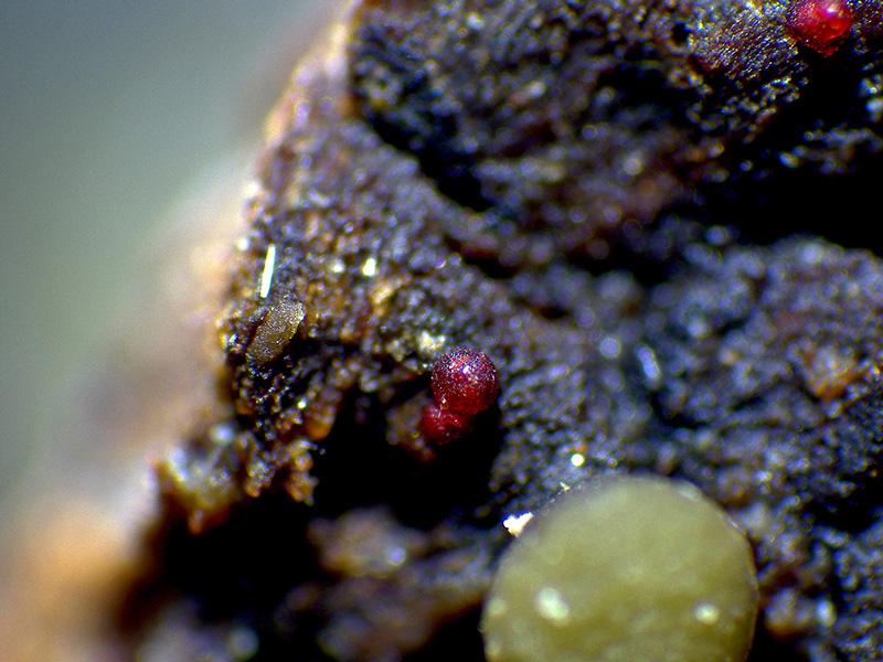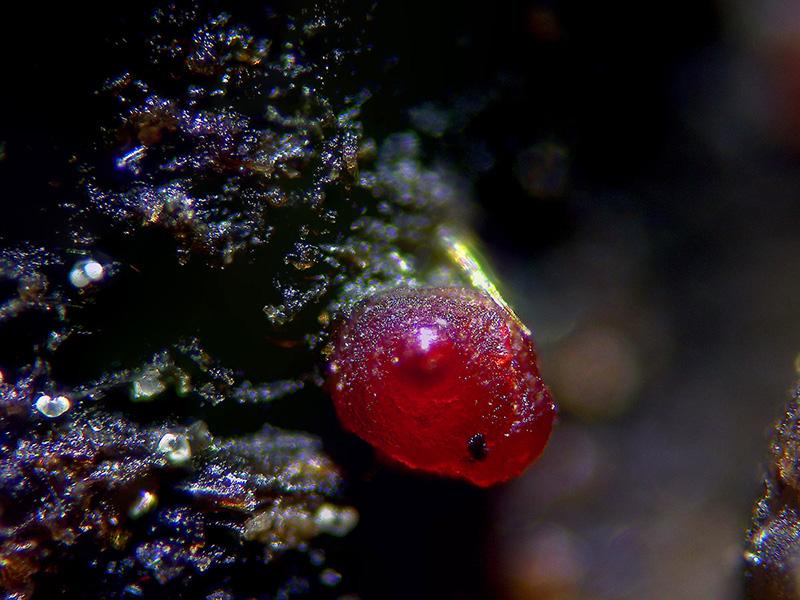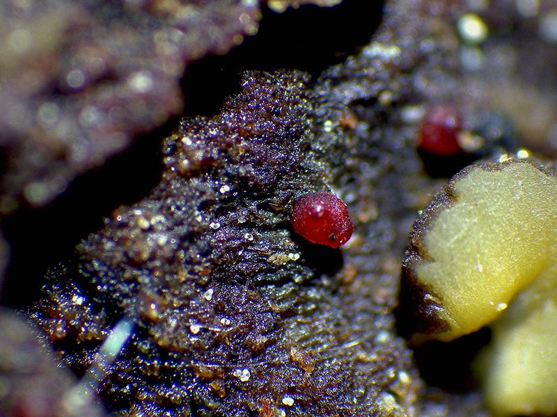 Muy diminutos peritecios, más o menos globosos con un mamelón en su parte alta, de un llamativo color rojo, brotando de manera dispersa y con un diámetro de tan solo entre 0,19 a 0,37 mm.