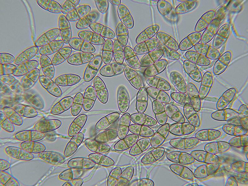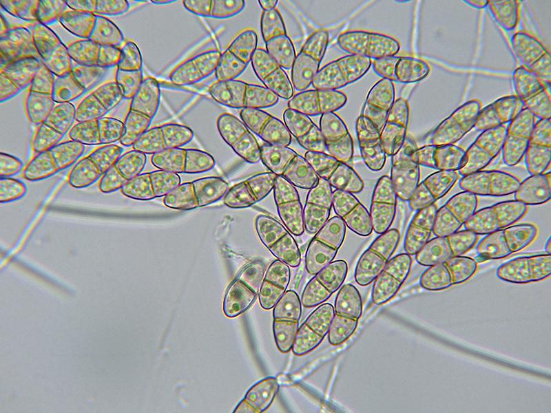 Ascosporas de pared aparentemente lisa, con un septo central en el que se observa un sutÃl constreñimiento, y contenido granuloso en su interior con unas medidas de: