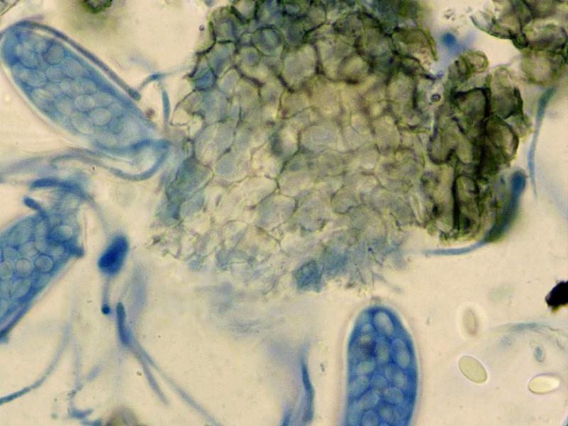 Hello,On wild horse dung I saw very small asco's again. This time dark brownish with a darker edge. Smaller than 0,3 mm, IKI-. More than 15 asci, I find it hard to determine how many spores but my guess would be more than 64.Â