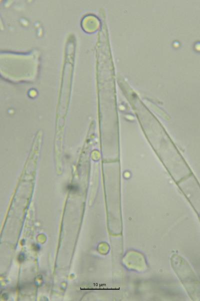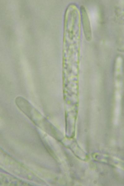 Asci without croziers, IKI+(bb). Paraphyses up to 5 µm wide, asci about 50 x 5 µm.