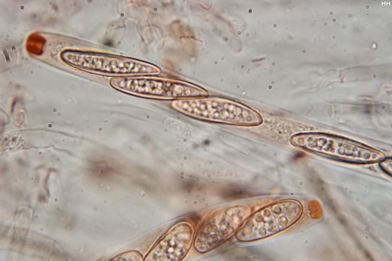 Asques très longs, cylindriques, à 8 spores, congophiles, crochus + ; Anneau apical déjà dans l'eau