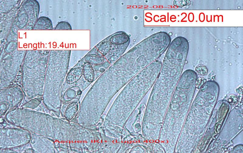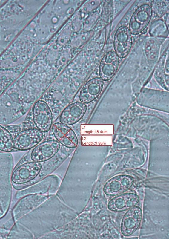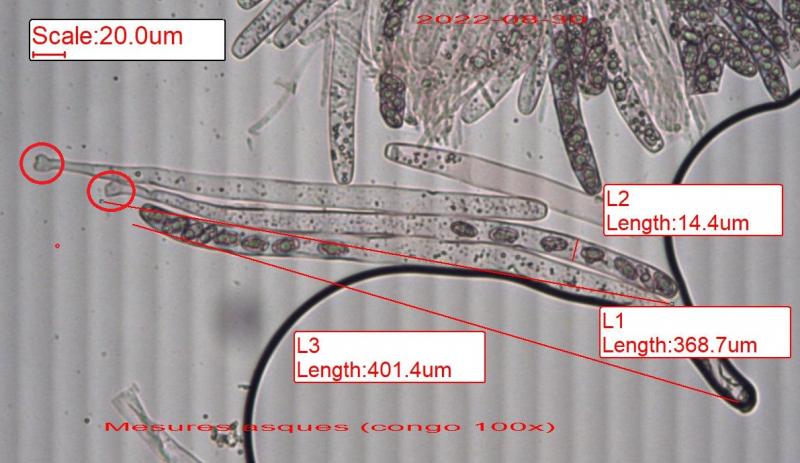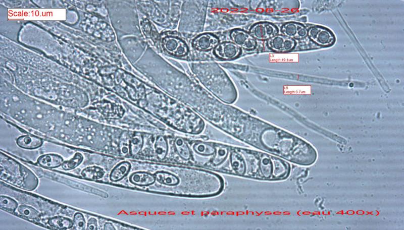 Asques avec crochet, J+ dans le lugol, pouvant dépasser les 400 x 20 µ, paraphyses minces, pluriseptées (4 µ) légèrement épaissies à l'apex. contenu peu réfringeant.