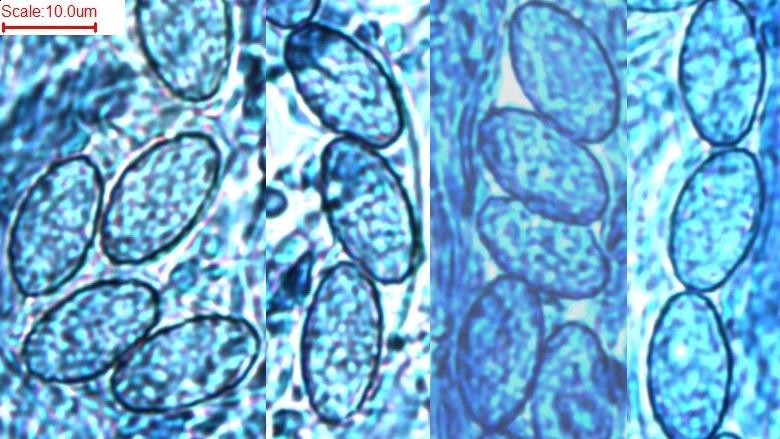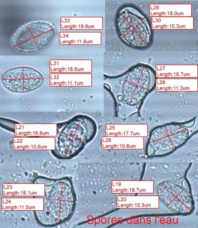 Spores éjectées peu nombreuses, biguttulées dans les asques (une grosse et une plus petite), mesurées dans l'eau : M = 18.3 x 11 µ Q = 1.7. Ornementation assez basse en courtes chaînes sans former de réseau.