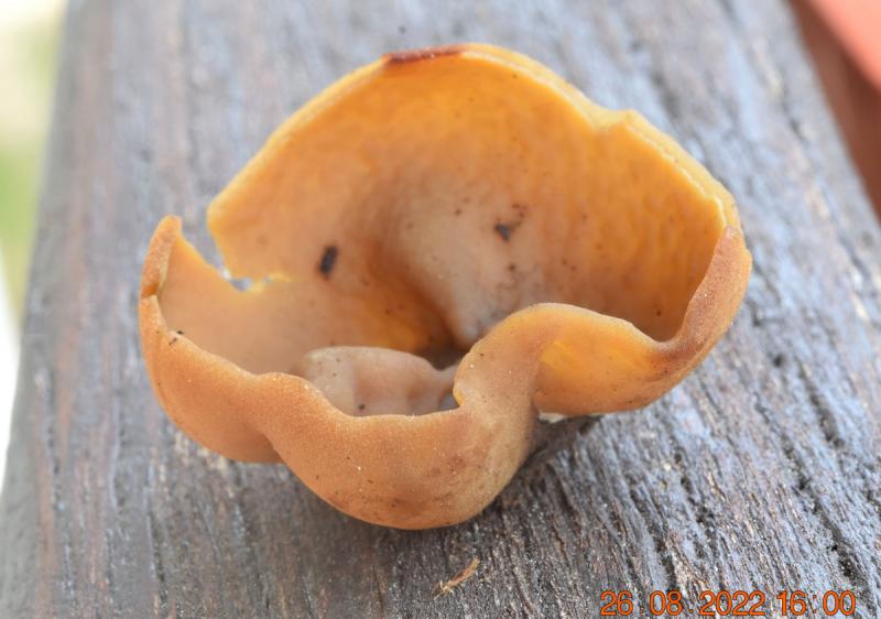 Voici une apothécie solitaire sessile d'environ 4 cm trouvée dans la boue près d'un petit ru. Photographie non in situ pour plus de confort. D'une tonalité sur le frais, beige clair un peu rosé, en particulier sur les bords. Les veines du fond ont une couleur plus olivâtre. En séchant elle s'éclaircit pour devenir ocre brun, l'intérieur restant toujours un peu olivacé. Chair concolore peu épaisse non succulente.