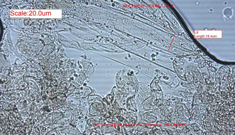 Je n'ai pas réussi à mettre en évidence les grosses cellules rondes de l'excipulum, probablement du à ma difficulté à procéder à des coupes minces sans loupe binoculaire.