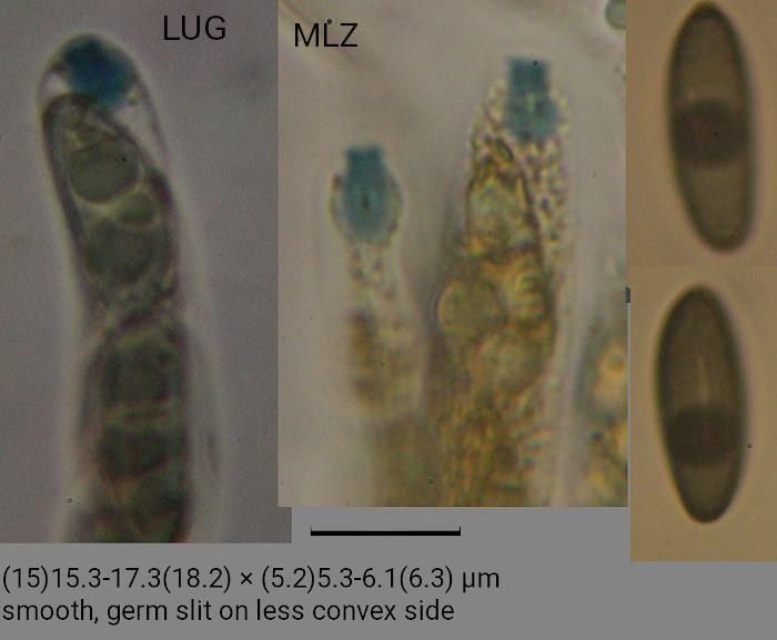 I don't have much experience with Nemania and would appreciate some help here. Spore size and germ slit lead me to N. aenea, but neither variant fits. MLZ+ reaction excludes var. aureolutea, inconspicuous germ slit excludes var. aenea, lack of white matter in stromata excludes var. macrospora. Or is it this large-spored form of N. serpens var. colliculosa: http://ascofrance.com/search_forum/46141