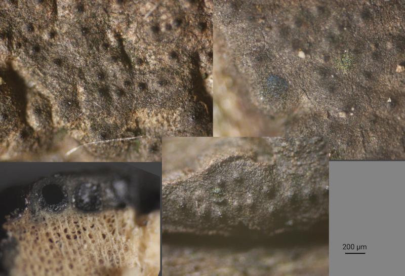 These 0.5 mm diam. acervuli were breaking through