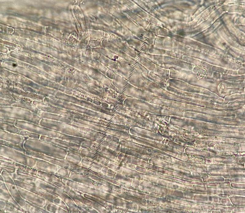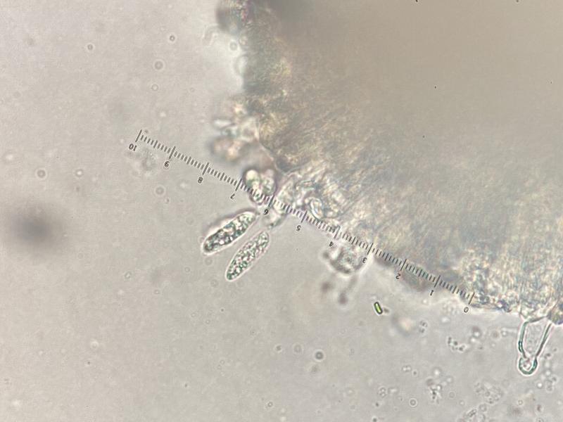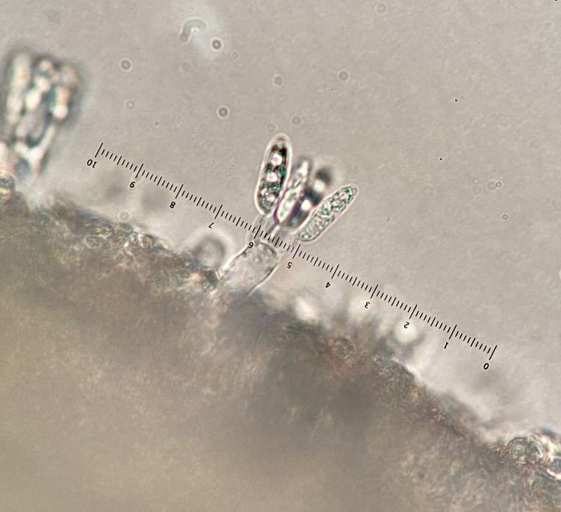 Basidia 4 spored, spores elliptical to fusiform, aseptate, measuring ~20 x 5 um.