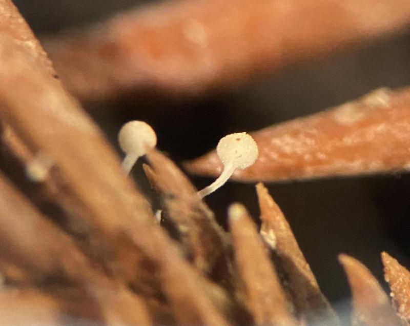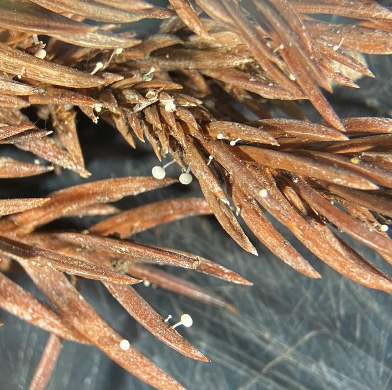 Does anyone recognize this fungus fruiting from dead Cryptomeria japonica needles?