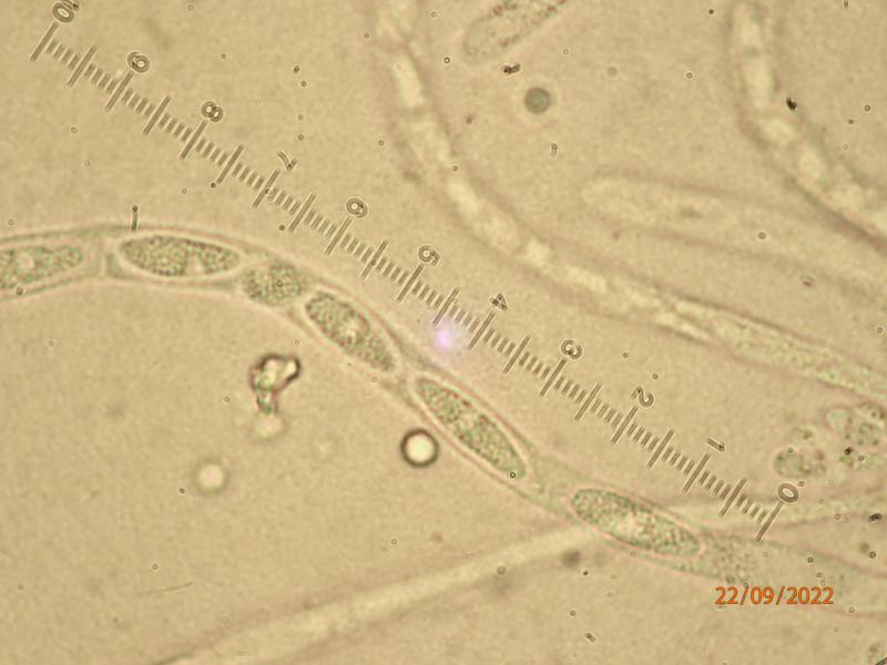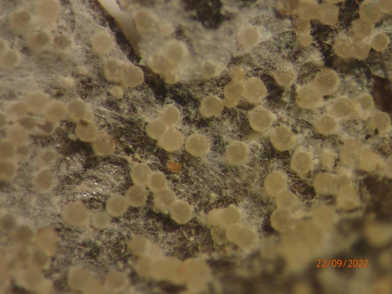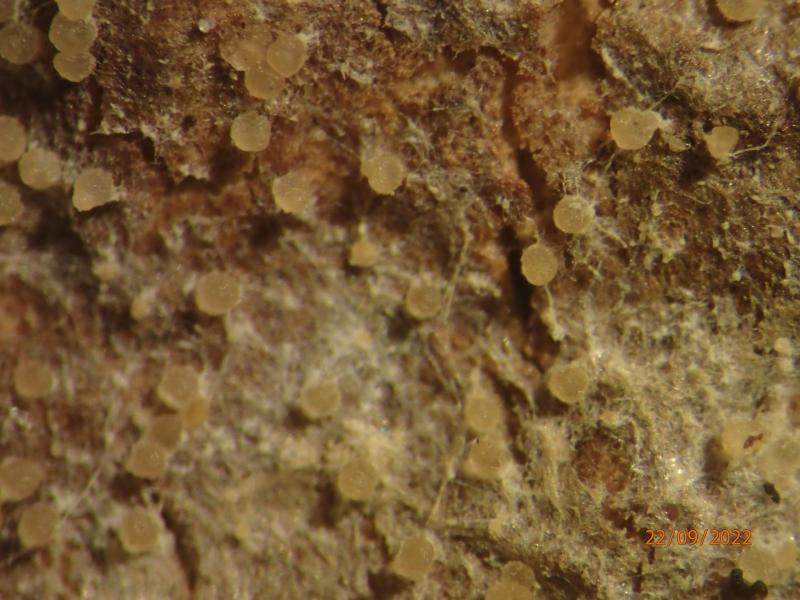 Hi! Found on Stereum sanguinolentum hymenium, Central Norway. Perithecia off-white to pale yellowish, up to 0.25 mm in diameter, somewhat conical, seated on a white, fluffy subiculum. Ascospores 17-25 x 5-6 micr., distinctly warted, becoming 1-(-2?) septate, apiculate (apiculi 1-2 micr.).I find this consistent with Hypomyces albidus, whose teleomorph I believe is exclusively found on S. sanguinolentum basidiocarps. Any Hypomyces expertise here?