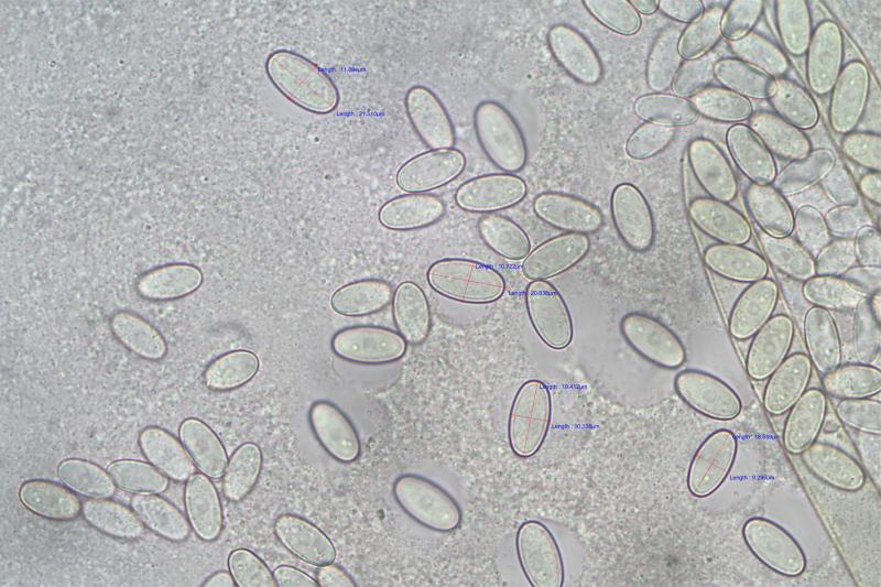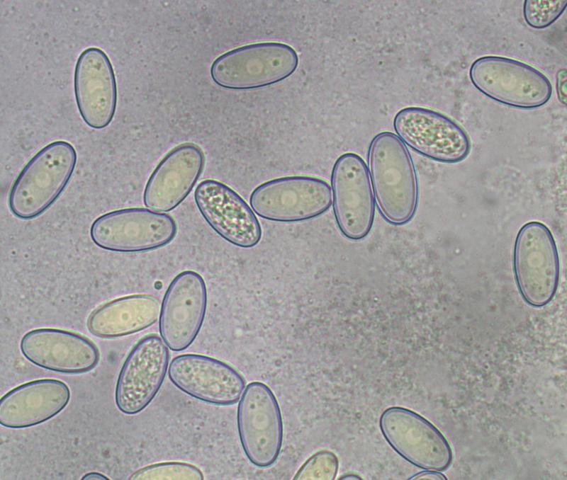 Spores show a nucleus and some internal granules, 18.7-21.3 x 9.3-11.1um