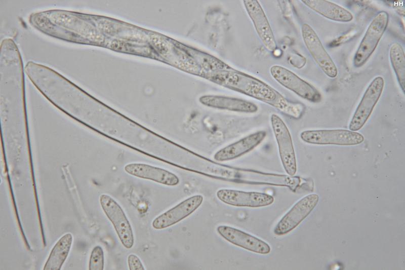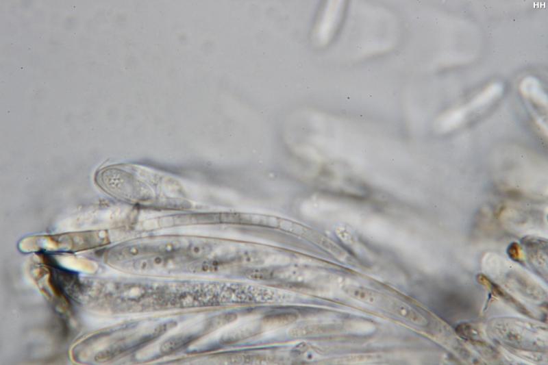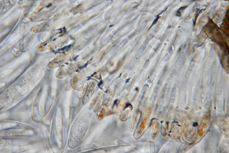 Asci clavate, 8-spored, IKI blue, croziers +; - 85.7x8.5 - 81.0x8.0 - 73.9x7.4;