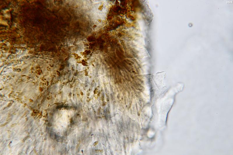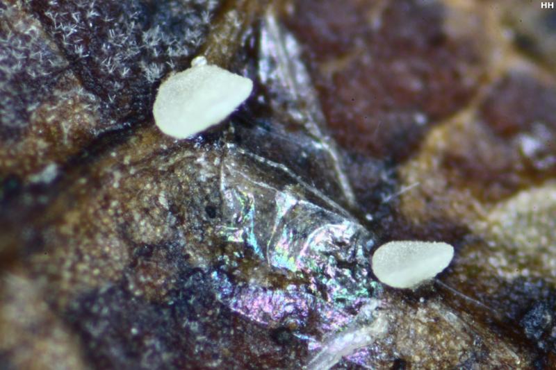 FBØ 0.2-0.4 mm; tiny, white, short-stalked fruiting body (cushion-shaped hymenium) on fallen, brown oak leaf; FB turns yellow-green with KOH 3%,; discoloration of pressure points: reddish-brown;