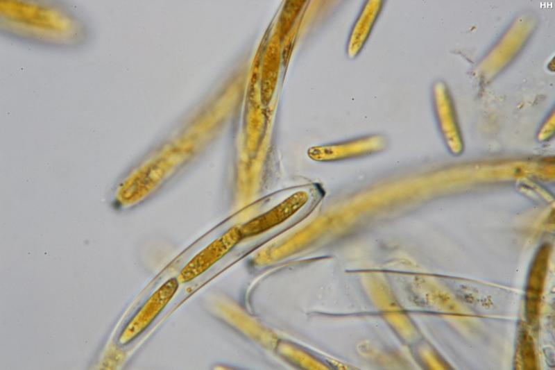 Paraphyses cylindrical, apically slightly clubbed, multiply septate, apical cell with strongly refractive grayish yellow VB; underlying cells also VB's, but only gray and with numerous large gas bubbles; Ø apically 3.3-3.6, below around 2 µm;