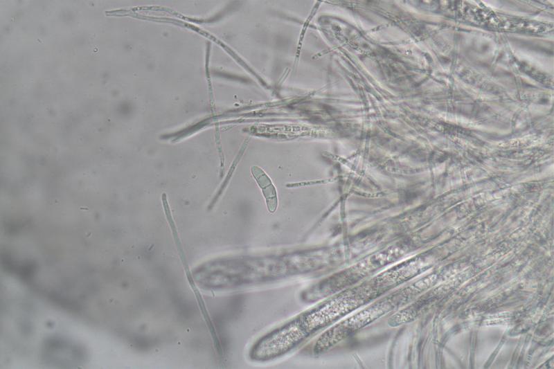 Spores hyaline with small inclusions, 3 septa, 19.3-23.7 x 4.6-5.3um