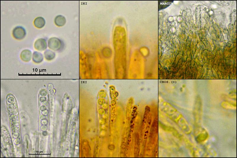 Asci with croziers, IKI+ dirty red - purple. Paraphyses cylindrical, with small low-refractive guttules. Margin cells with a roughened, hyaline tip. Spores globose, diameter 2.6 - 3.2 µm.