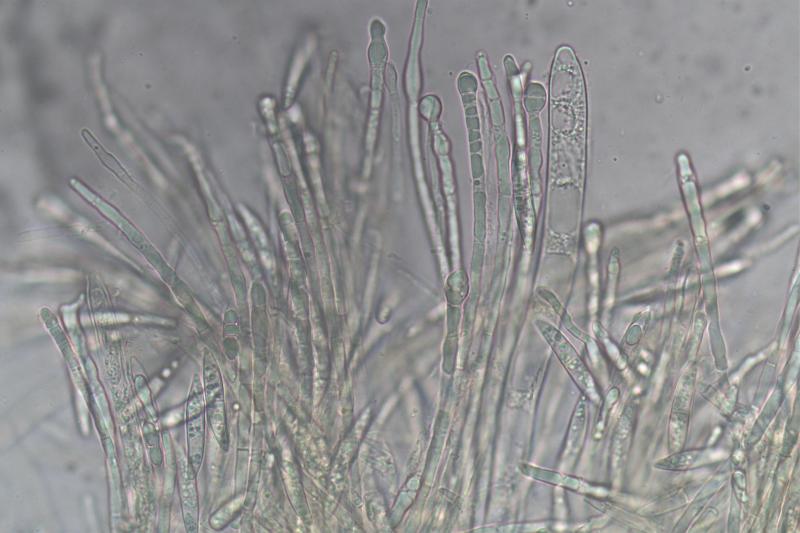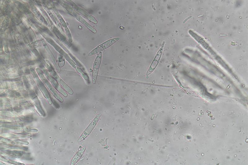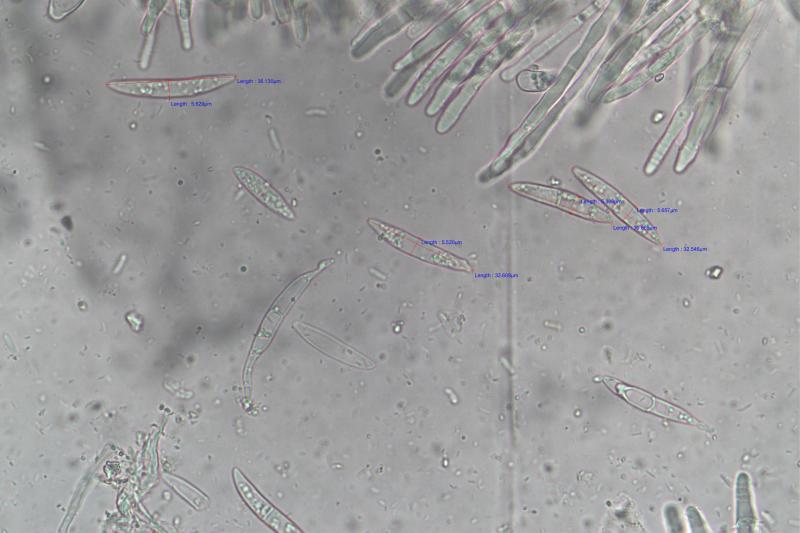 Spores: 30.3-36.1 x 5.2-5.9um, many 1 septate, occasional 2 septate, budding