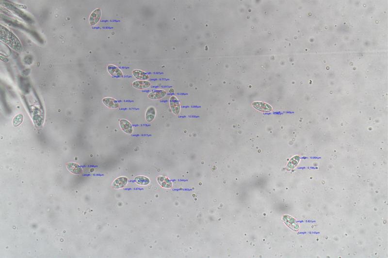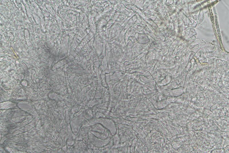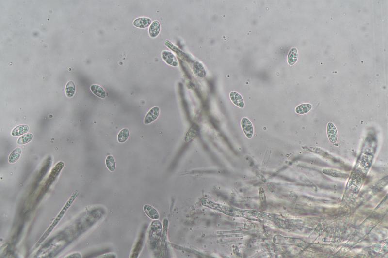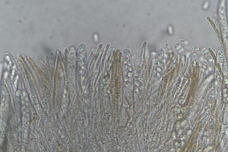 I assume you mean 9.5-12(-13.5) µm for the spores. At first I was reminded for Phaeohelotium succineoguttulatum but there the spores are regularly large-guttulate and much larger, also the asci much larger. But the guttulate paraphyses and the habitat would fit.