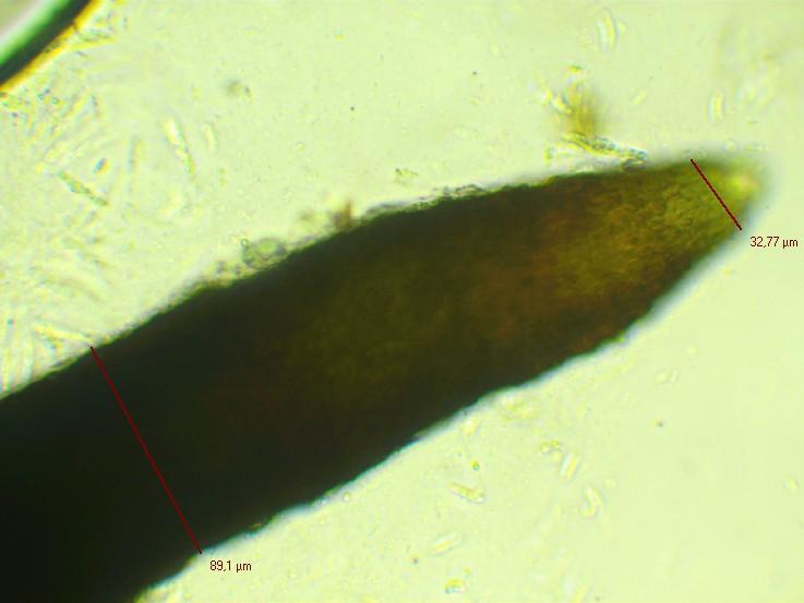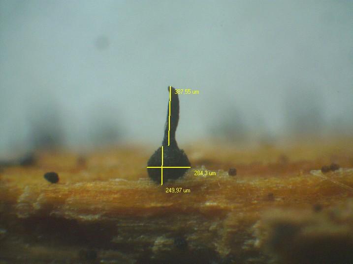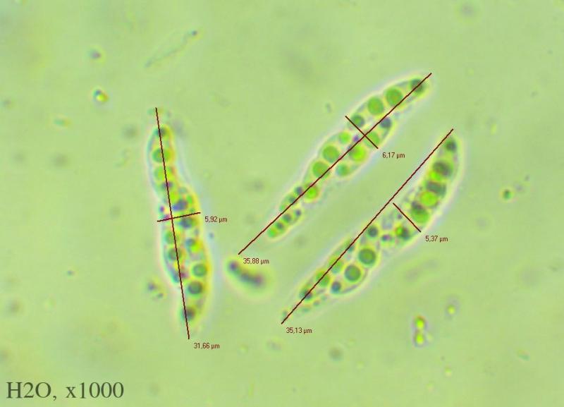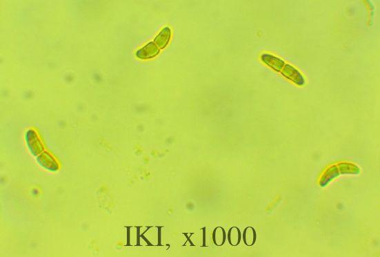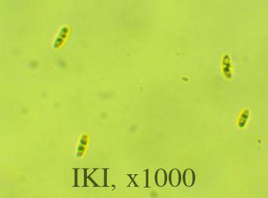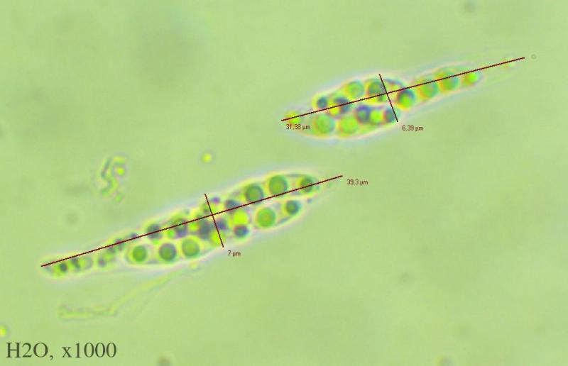 All asci with 4 small (5,5-6,2 x 1,6-2,1) ascospores and 4 larger (10,3-14,3 x 2,55-3,2) ones.