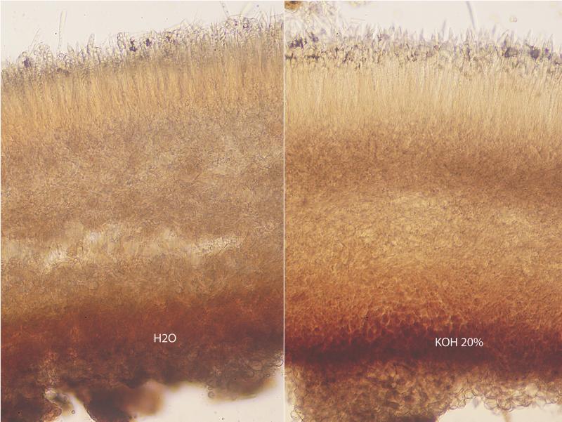 In the fresh state I see hardly any difference between a preparation in water and in KOH 20% (see the attach). Should the ionomydotic reaction be evaluated only on herbarium material?