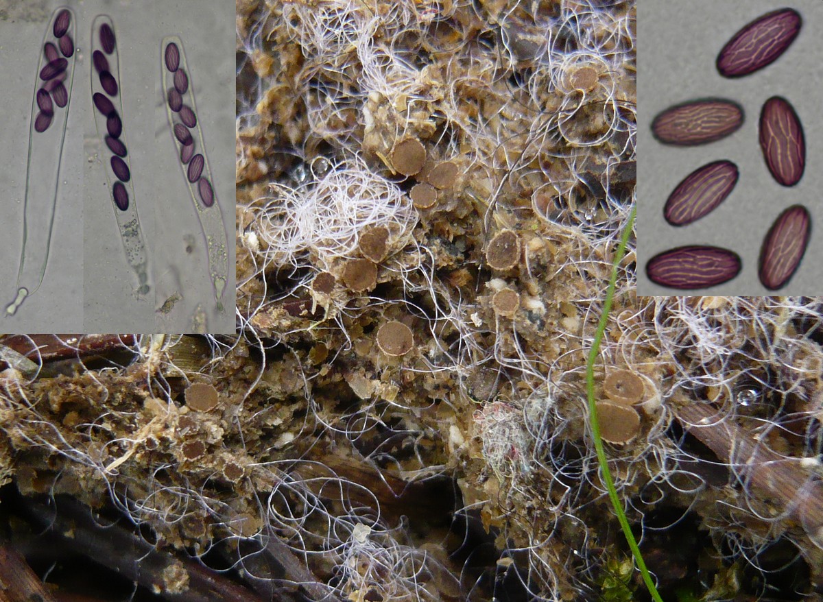 récolte réalisée sur excréments ou pelote de réjection. Asques 175-180 µm, spores 18,5-20 x 8,5-9,5 µm. Avec la clé de Doveri, j'aboutis à A. michaudii. Une belle planche d'Enrique, très ressemblante à ma récolte, est publiée sur Ascofrance.
