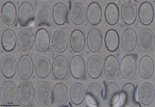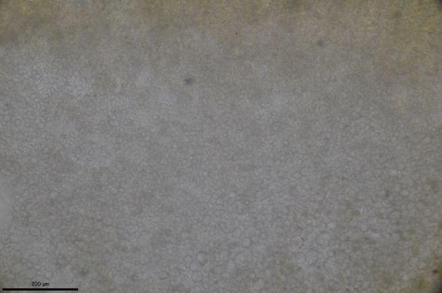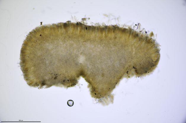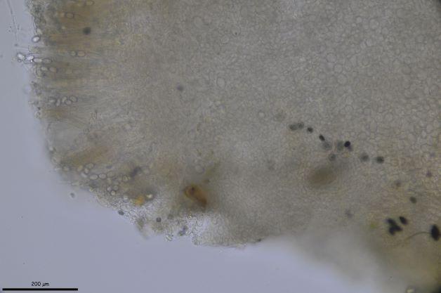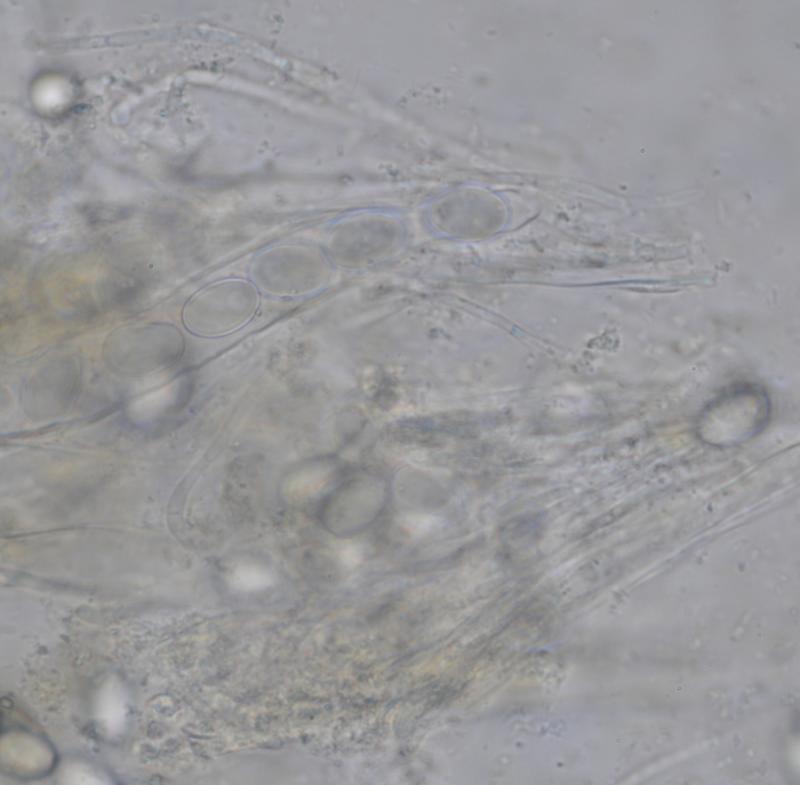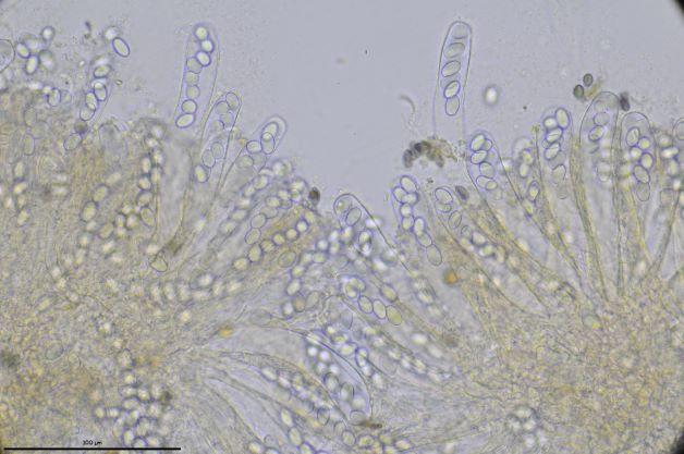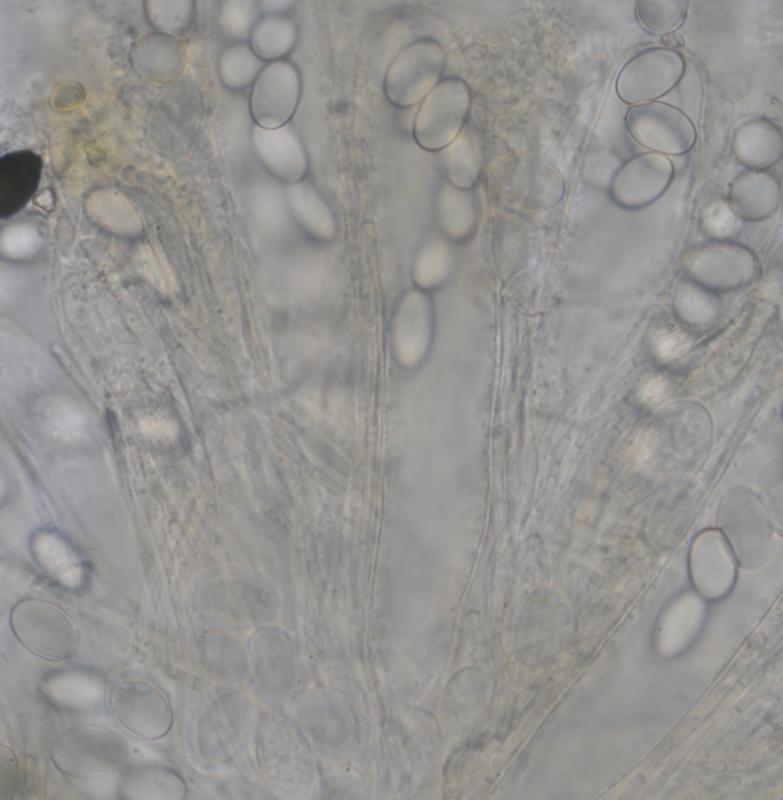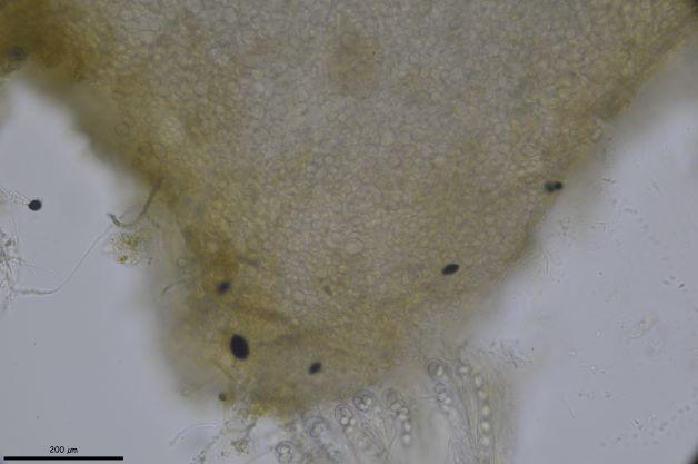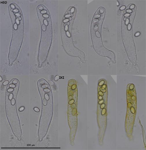 Apotecios discoides pulvinados, con margen irregular, gregarios o poco confluentes, sin estípite, de 1775,2 - 2022 × 938,9 - 1011 µm. Himenio de color amarillento a anaranjado, opaco, plano-convexo. Margen no diferenciado. Exterior del mismo color que el himenio. Ascos cilíndricos, estrechándose y curvándose en la base o en la parte media, operculados, octospóricos, biseriados, con el ápice ligeramente aplanado, aparato apical inamiloide, con uncínulo basal, de (87,1) 89 - 109,3 (110,8) × (15) 15,1 - 19,7 (21,1) µm; N = 32; Me = 101,7 × 18,1 µm. Ascosporas elipsoidales, sin LB, con núcleo y nucleolo visible cercano a un extremo, de (11,3) 11,7 - 12,8 (13,6) × (7,1) 7,5 - 8,2 (8,6) µm; Q = (1,4) 1,45 - 1,6 (1,7); N = 41; Me = 12,2 × 7,9 µm; Qe = 1,5. Paráfisis cilíndricas, multiseptadas, en ocasiones bifurcadas cerca del ápice, ligeramente engrosadas en el ápice, sin VBs. Excípulo medular con textura subglobulosa-angularis con algunas células con textura intricata. Excípulo ectal con textura subglobulosa-angularis y tendiendo a textura prismatica hacia los márgenes. Margen compuesto por células isodiamétiras a ligeramente elongadas.