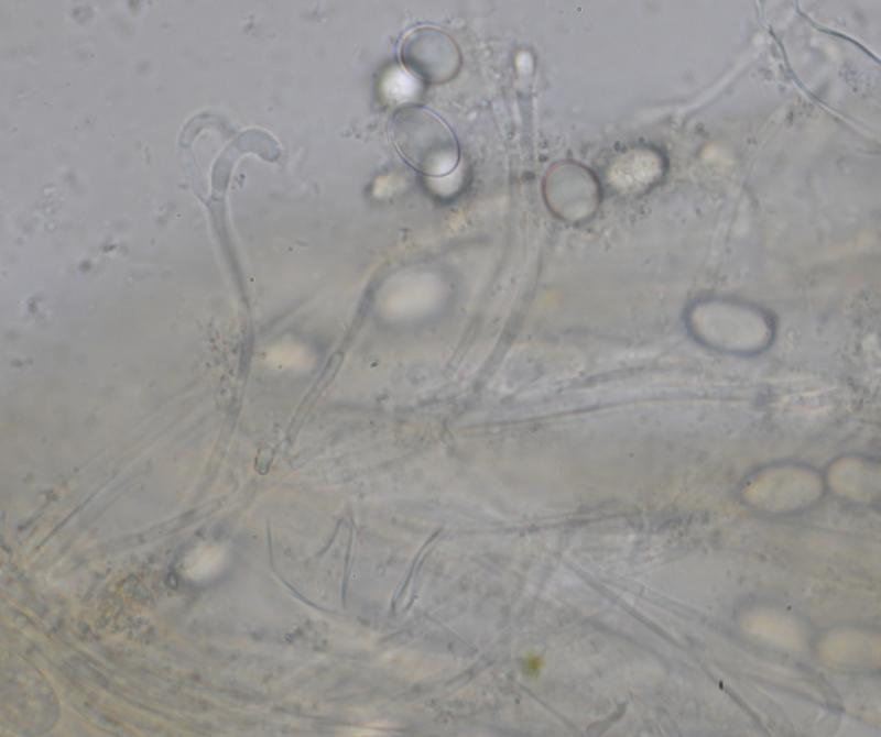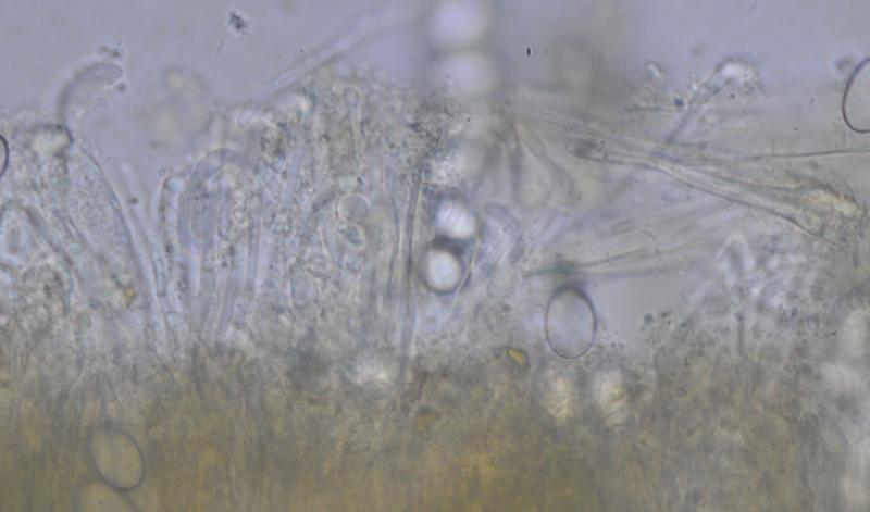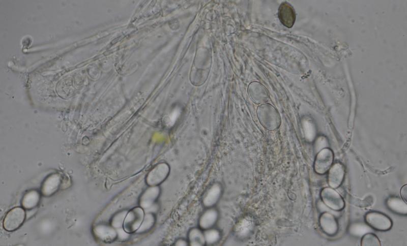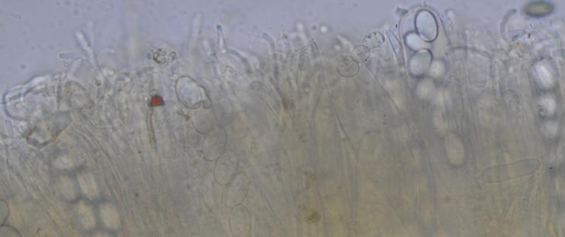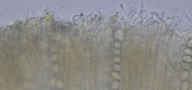 C.ochraceus tiene esporas más largas; tal vez aurora, aunque el color me parece un poco pálido. Mire también en el lado de aff.luteus. Tampoco estoy pensando en C.epithecioides que tiene paráfisis hinchadas en la parte superior.
