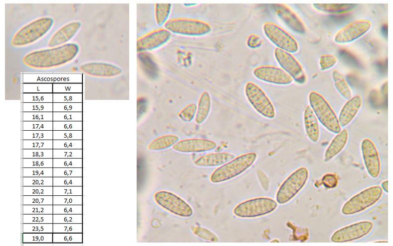 Perithecia are orange-red, cupulate when dry, grouped above the stromata of unknown sterile Pyrenomycete on the dead branches of Aesculus hyppocastanum. Yellow pigment is released after preparation in KOH. Paraphyses are absent, asci in a bundles. Asci 8-sporous, uniseriate, 129-138 ? (9,5) – 12,2 – 12,4, with a short mostly absent stipes. Ascospores hyaline, muriform when mature, 15,6-23,5 x 5,8-7,6.