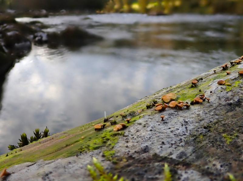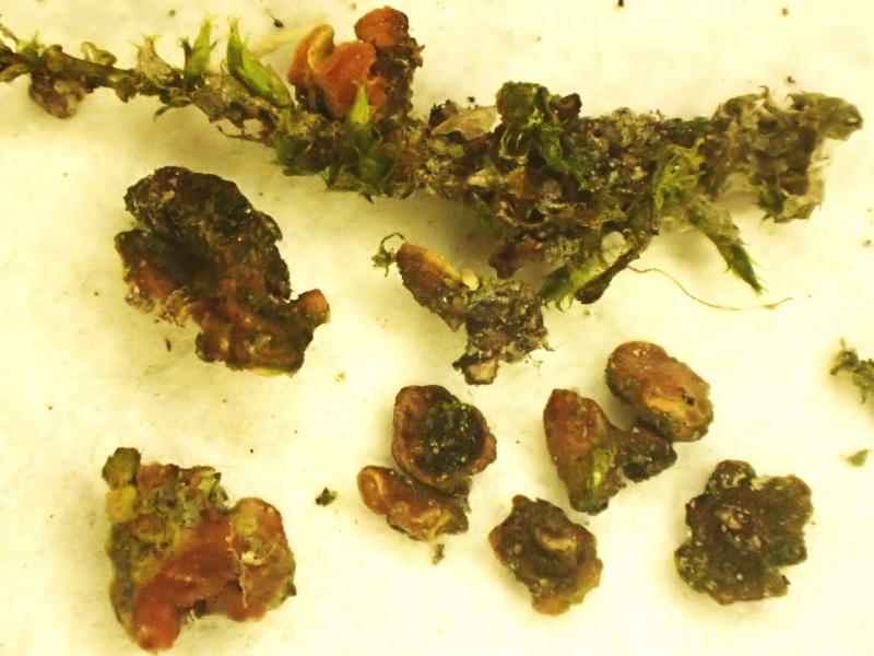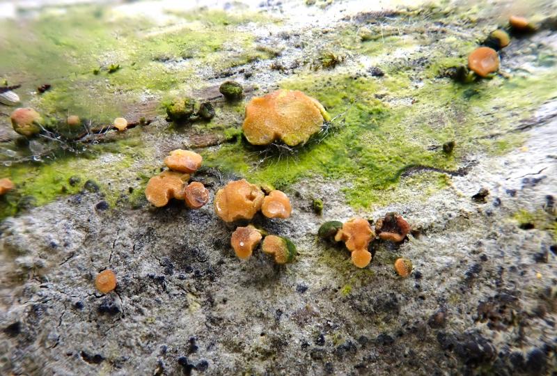 Re : Orange, dark-stipitate apothecia on alga-covered wood in flood zone