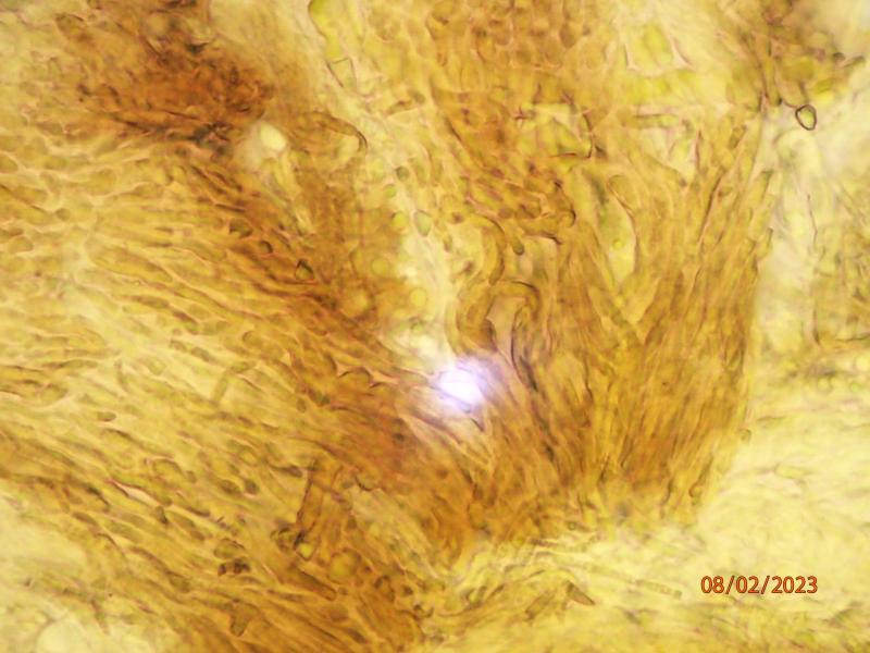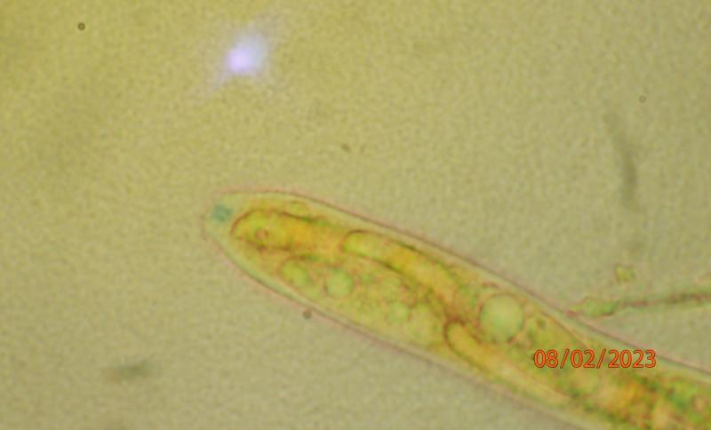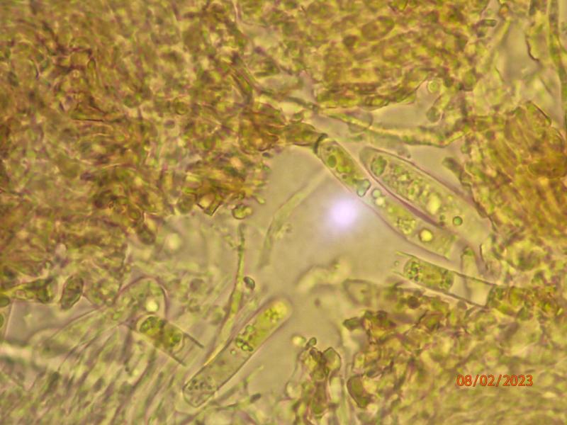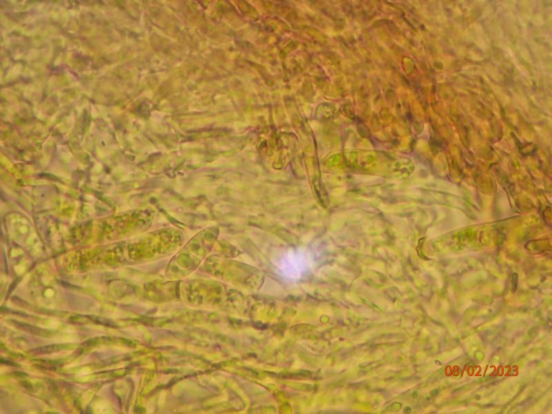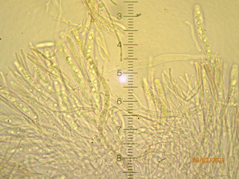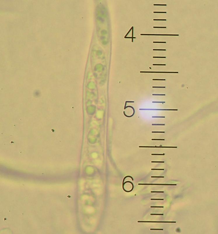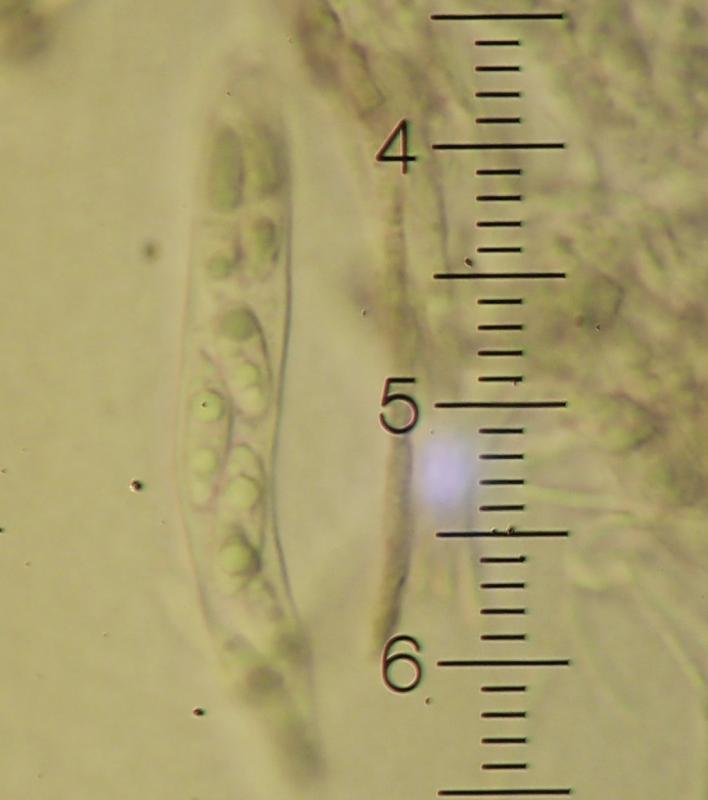 These apothecia were found in cracks on a mossy log with algal growth in a frequently flooded area. The underside is pretty dark, as are the rather short stems. The ectal excipulum consists of intertwined brown hyphae with cylindrical algal cells imbedded. The lower side of the excipulum is almost covered in algae. It almost appears that the fungus is lichenized, but I guess that is an illusion.I am still trying to figure out vital taxonomy/microscopy. The images below are from material which has been dry for months, mounted in water (except for the IKI one, in Lugol). I hypothesize that we see living spores inside (and outside) dead asci, but I'm not sure. The spores measure approx. 5-6 x 15-17.5 micr. Asci 90-100 x 7.5-10 micr. Spores contain a few large and sereval small guttules. Paraphyses are a bit difficult to interpret clearly - some seem filiform, some thicker and acuminate, some brownish with granular content. I assume they are dead? I have not seen croziers. The ascus pore stains blue in Lugol (no pre-treatment)