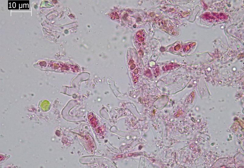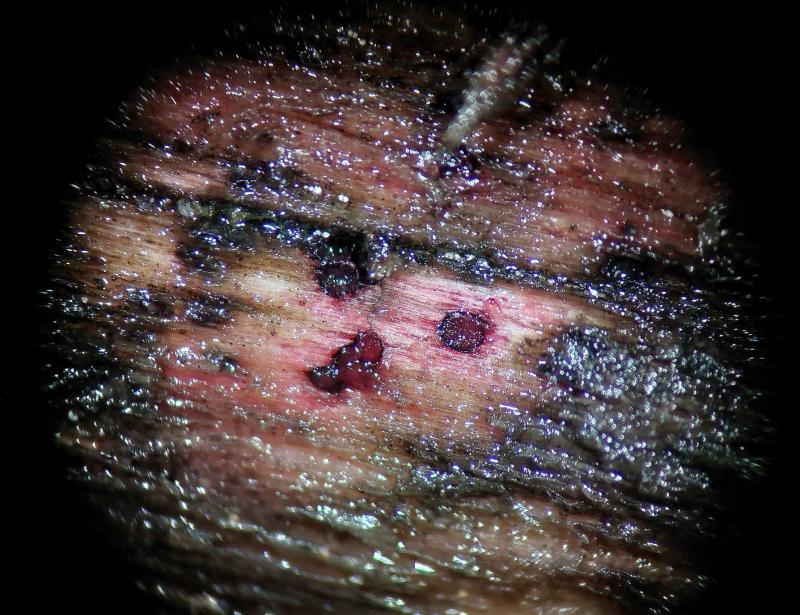 These 0.5 mm diam. acervuli were breaking through