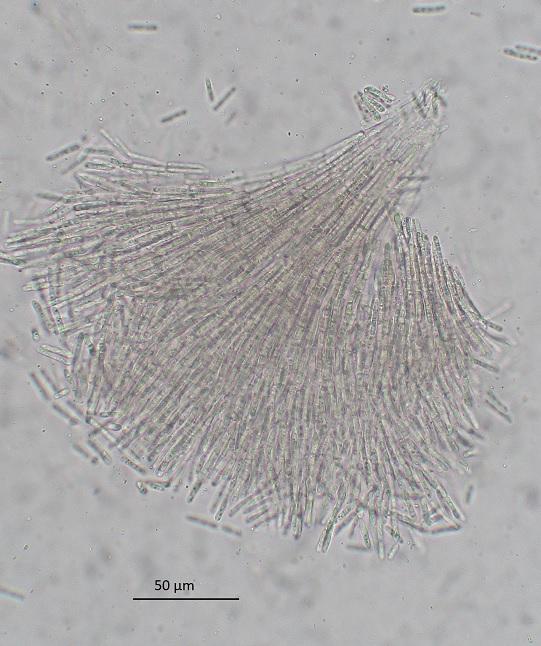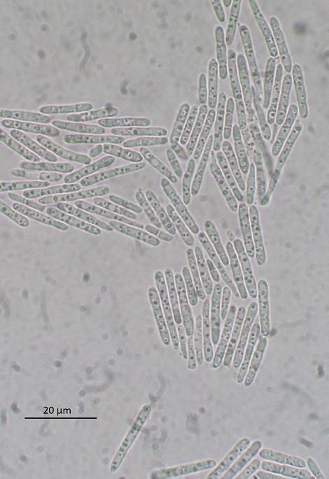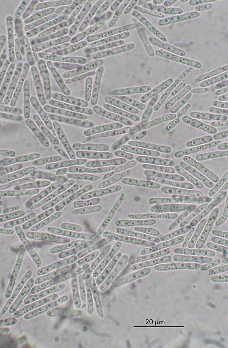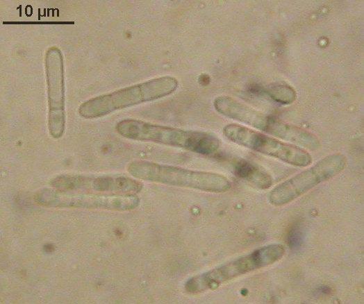 HB 8411: Chemnitz, Zeisigwald, coniferous boards, very rotten wood. Fb. 0.5-1(-2) mm diam. Conidia *11-20 x 2.3-2.8 µm ((1-))2-sept., partly guttulate (always when still in chains).