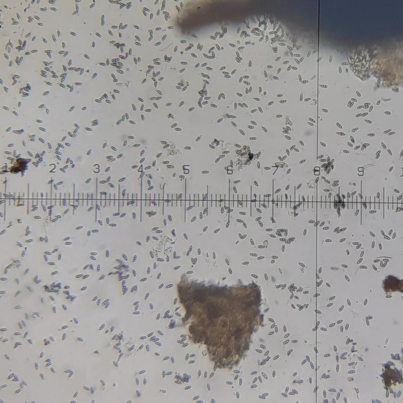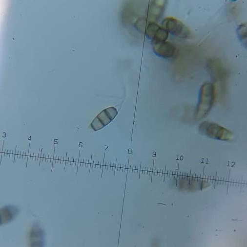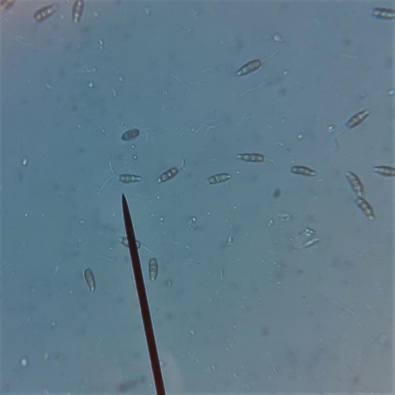 Conidia 4 septate: 22-29 um x 5- 8 um. (400x magnification)