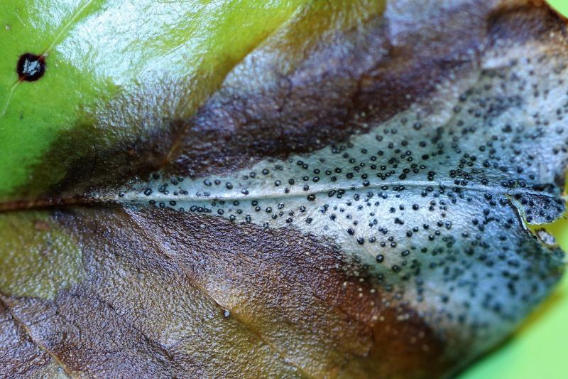 Found in the Netherlands (feb. 2023) on a leaf of Camellia japonica. Upperside of the leaf with acervuli.
