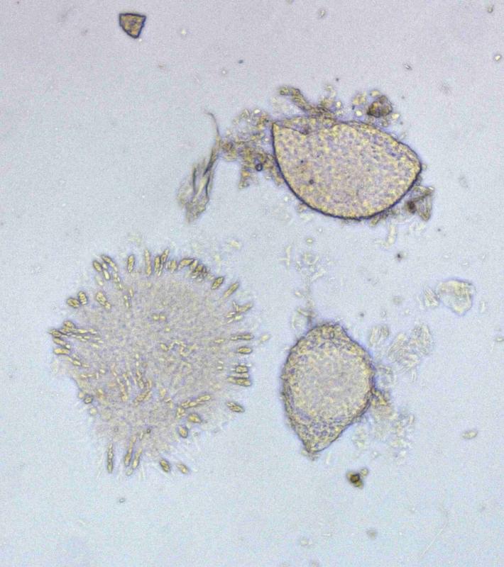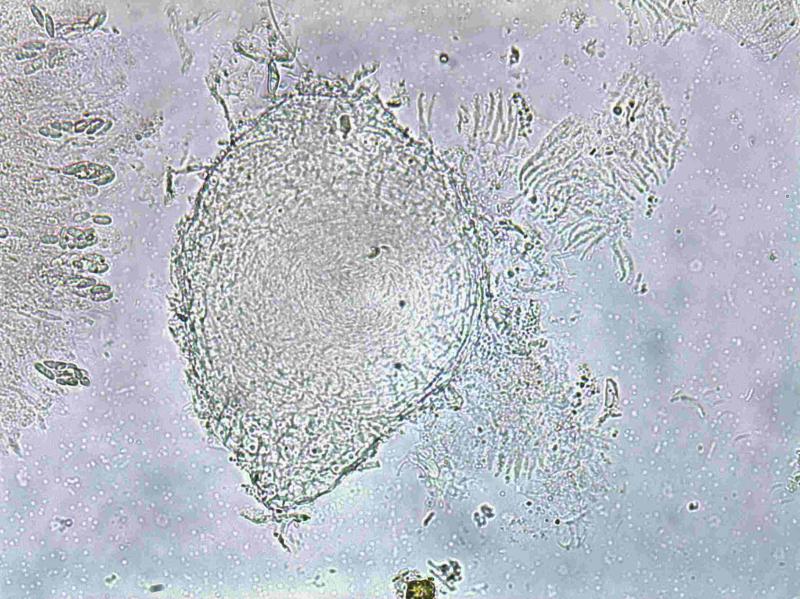 Preparations were difficult to make and photography was no sinecure either. When applying a coverslip, the perithecia shot away from under the glass. To recover the fruiting bodies during a second attempt, I had to insert a piece of leaf along with the FRB's. Due to the very small size and high transparency, focusing was difficult (limitation quality microscope!).