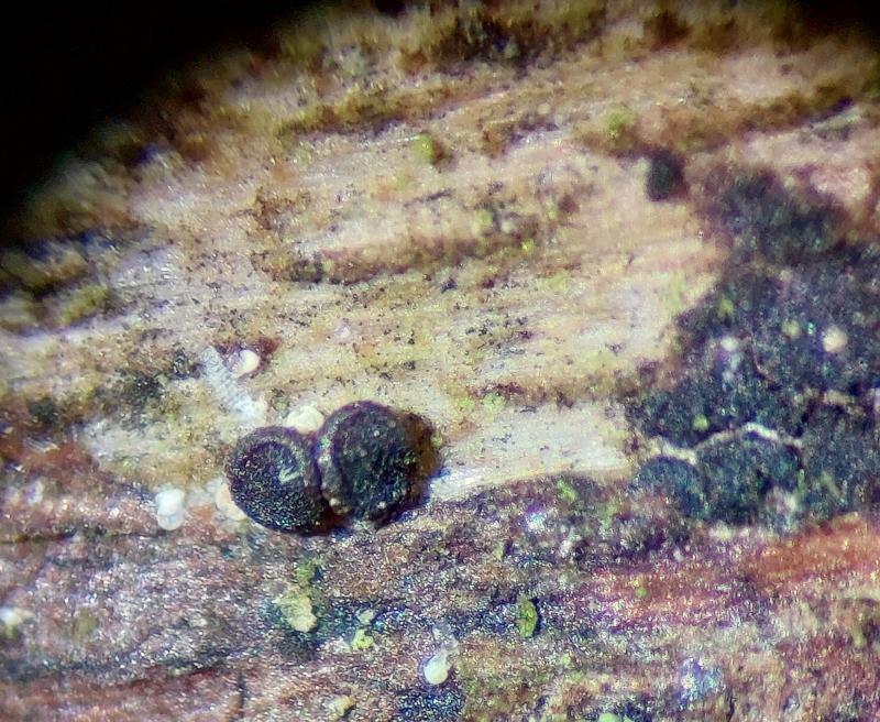 The black apothecia are approx. 300 -500 ym in diameter.