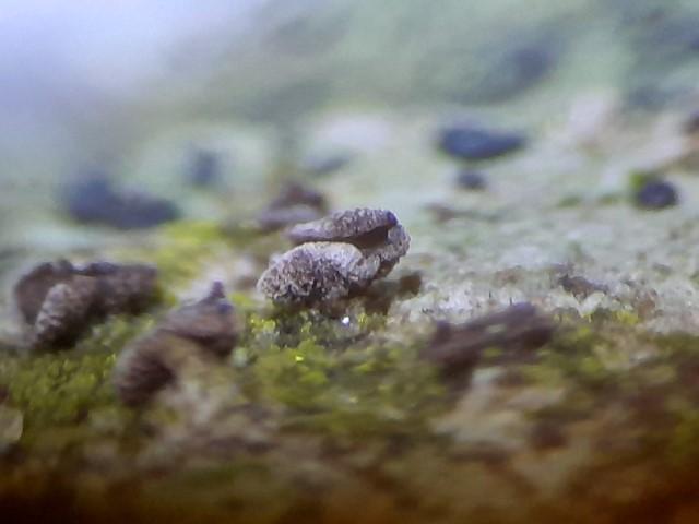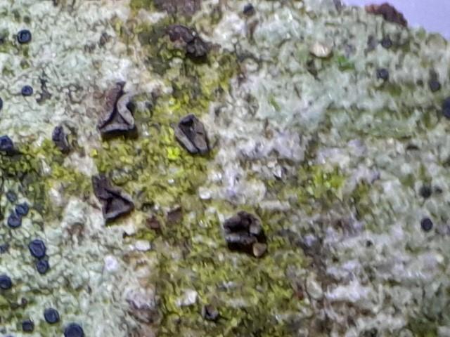 Occurs on bark (Acer), possibly on algae, but clearly not on the lichen nearby (Lecidella elaeochroma).