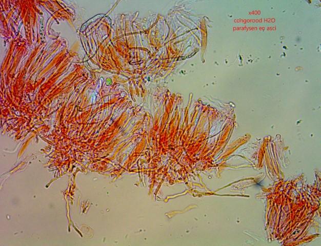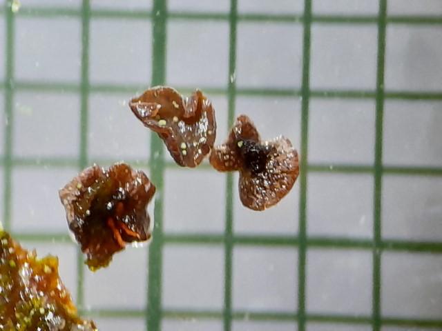 Fungus peziza-like very small (1 to 2 mm) with fan-shaped rim. Substipitate, somewhat triangular in side view.